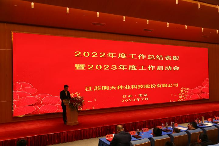 “律回春暉漸,萬象始更新”。在春暖花開,萬物復蘇的新年伊始,2月5日江蘇明天種業(yè)全體人員齊聚南京圣和文化交流中心隆重召開2022年度總結表彰暨2023年工作啟動大會。公司全體領導班子成員、2022年度先進和優(yōu)秀員工代表及子公司員工等160余人參加了會議,會議由公司副總經(jīng)理胡玉成主持。